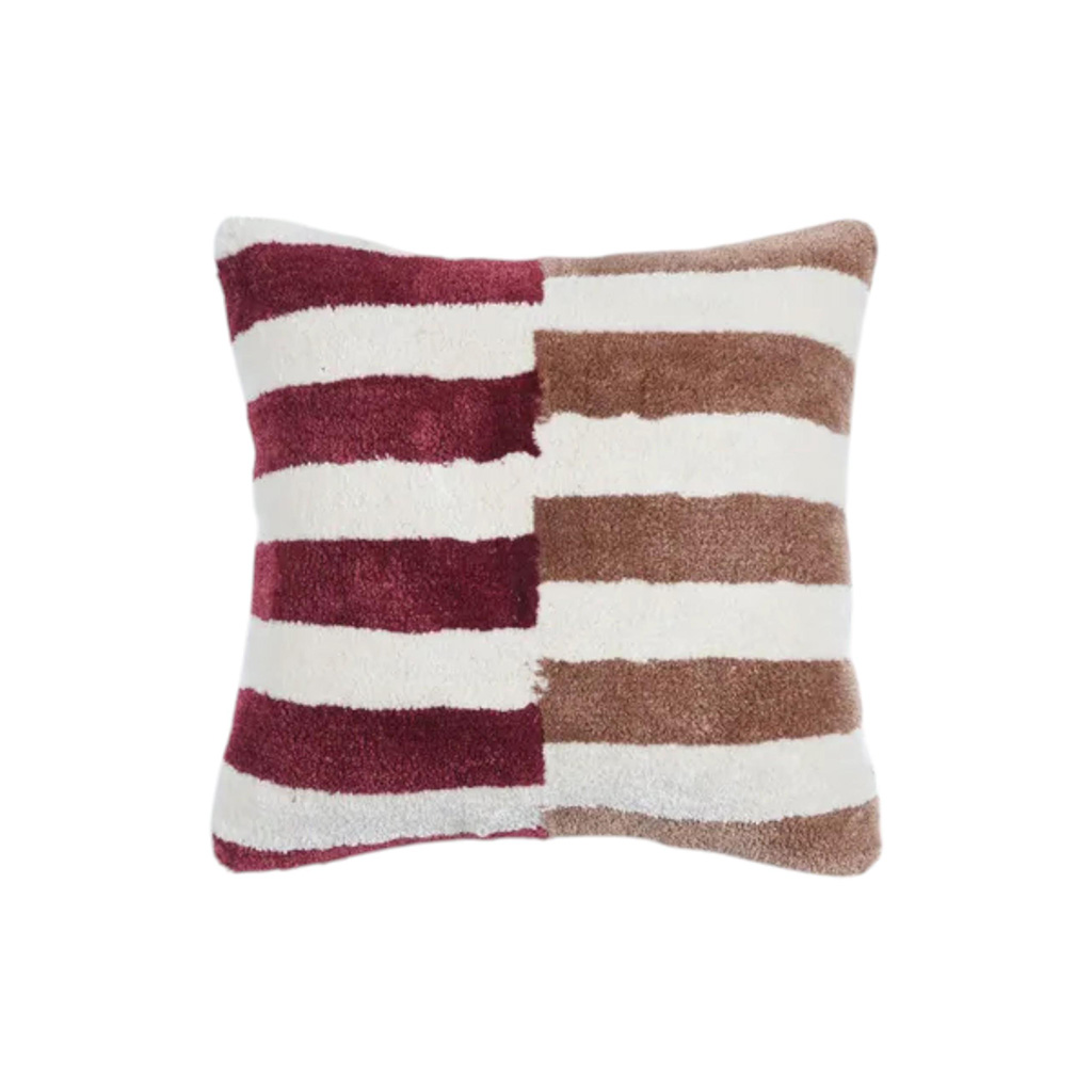 Cojín decorativo cuadrado de tejido texturizado con diseño de rayas en tonos burdeos y arena.